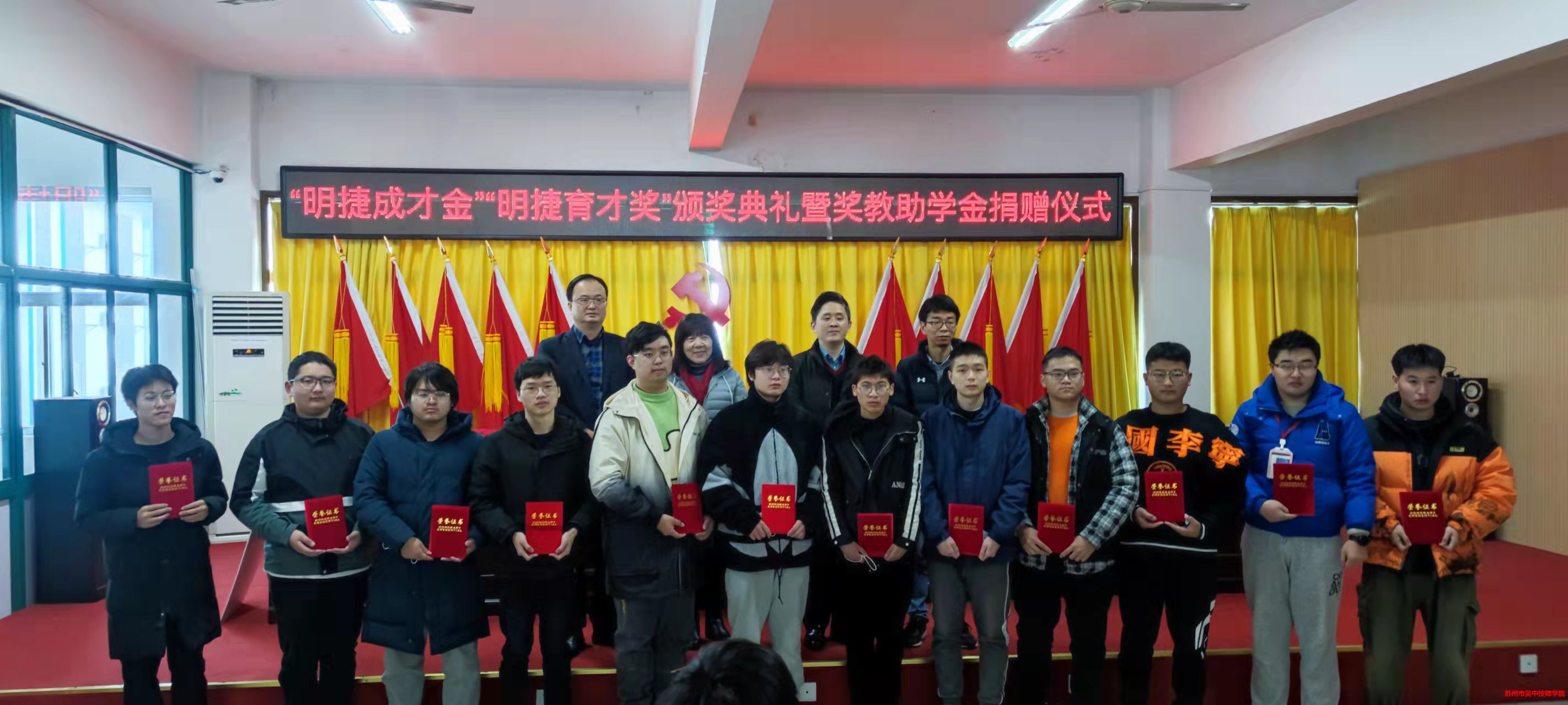 參加本次頒獎典禮活動的有蘇州明捷精密機(jī)械有限公司總經(jīng)理何華軍同志、人事經(jīng)理陳佳林同志、我院副院長湯燕萍和副院長單春兵同志及學(xué)院部分領(lǐng)導(dǎo)和20名獲獎師生,本次會議由我院學(xué)生科副科長石嘉平同志主持。
