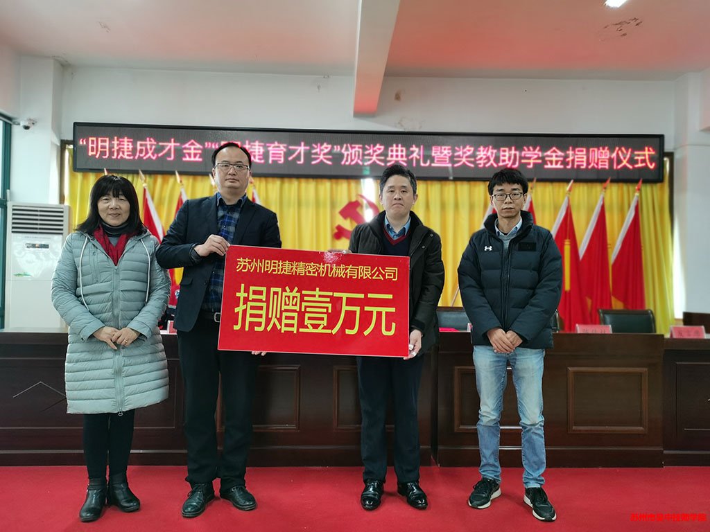 蘇州明捷精密機(jī)械有限公司總經(jīng)理何華軍同志發(fā)表講話。他表示尊師重教、培養(yǎng)人才,不僅是個人行為,更是社會責(zé)任。企業(yè)通過實(shí)際行動盡綿薄之力,也是向企業(yè)扎根、發(fā)展的吳中大地作出應(yīng)有的回饋。隨后,愛心企業(yè)向?qū)W院捐贈明捷成才獎、育才獎。