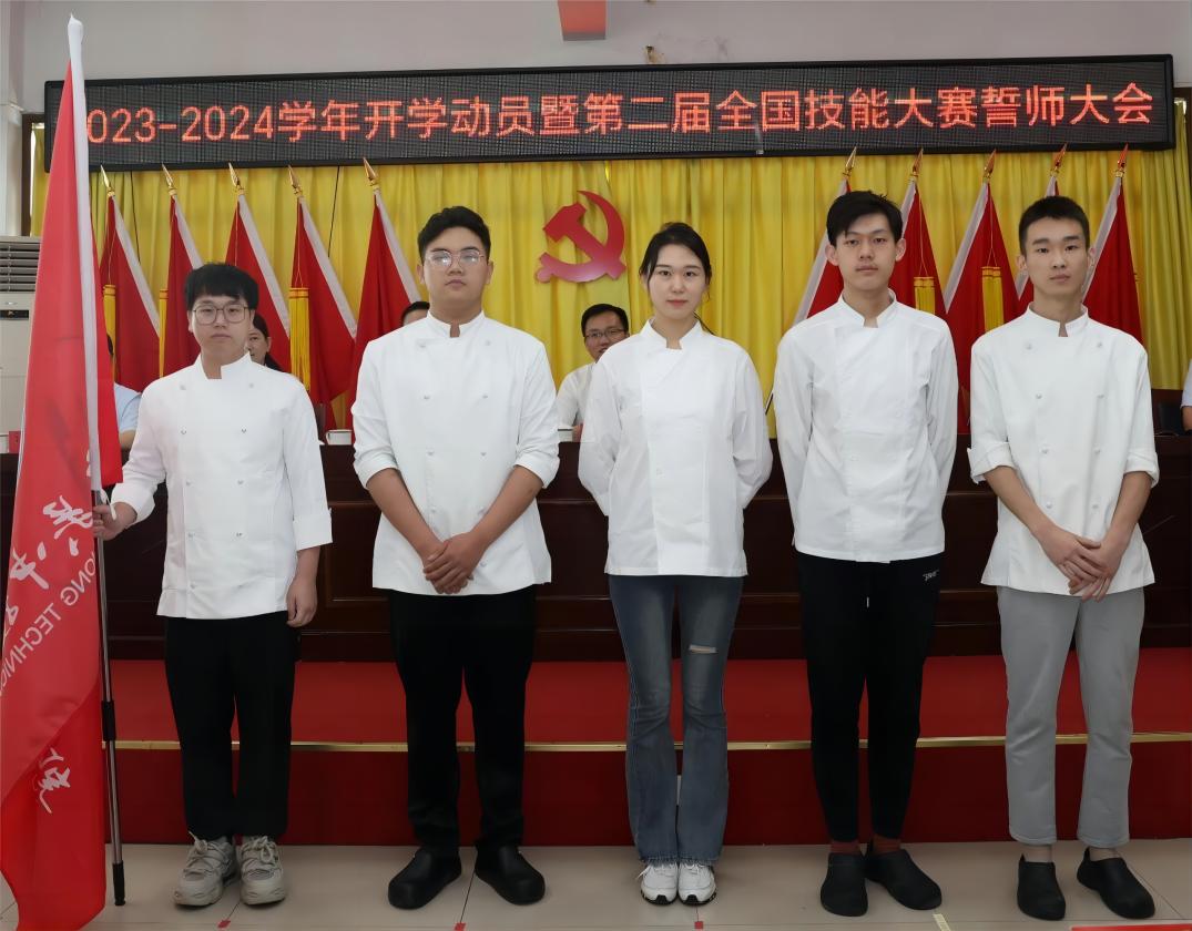 我院第二屆天津國賽師生代表龔鑫、李駿飛、劉欣茹、張家源、侯金辰,代表參賽團(tuán)全體團(tuán)員,莊嚴(yán)接過馮局長傳遞的院旗!沉甸甸的責(zé)任,金燦燦的榮耀,屬于吳中技師學(xué)院未來的天之驕子。